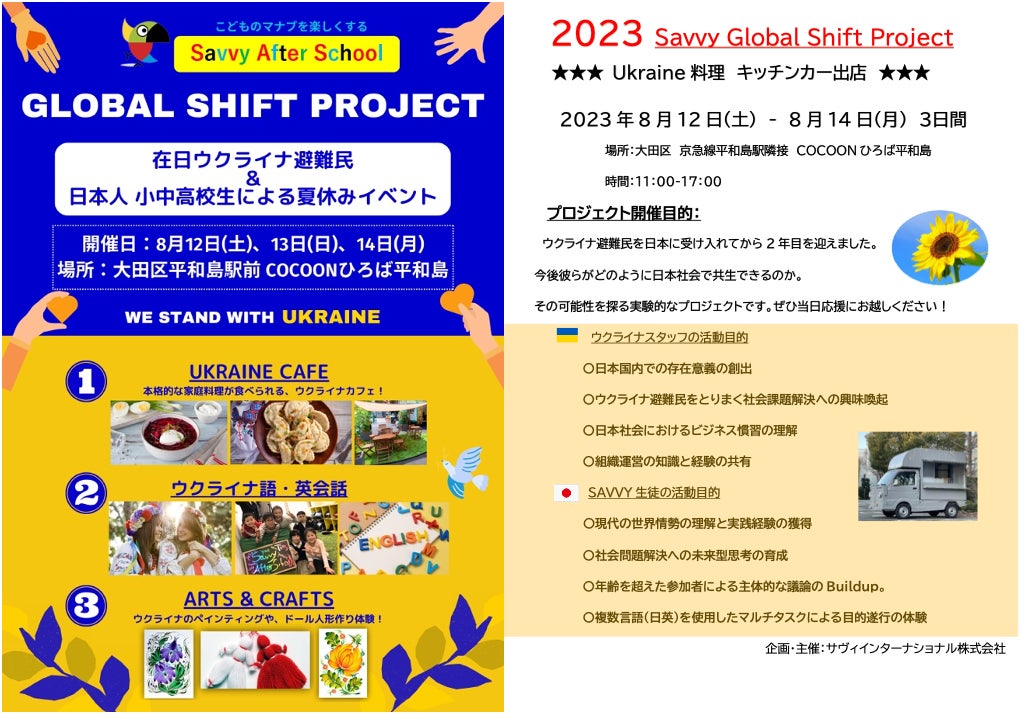 株式会社シンクロ・フード(本社:東京都渋谷区、代表取締役:藤代真一、東証プライム市場:3963)が運営するキッチンカー(移動販売車)のプラットフォーム「モビマル」と、京浜急行電鉄株式会社(本社:神奈川県横浜市、取締役社長:川俣 幸宏、以下「京急電鉄」)が協力し、サヴィインターナショナル株式会社(本社:東京都品川区、代表取締役:守安法子)が主催する、在日ウクライナ避難民が日本で共生するための実験プロジェクト「2023 Savvy Global Shift Project」を京急線平和島駅隣接の地域交流拠点「COCOONひろば平和島」(以下「COCOONひろば平和島」)にて8/12(土)〜8/14(月)に開催する。