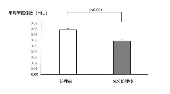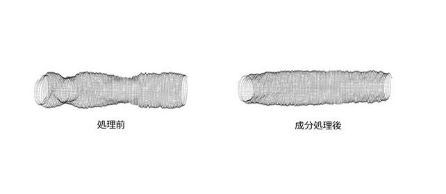 本研究では、毛髪表面の凹凸による手触りの悪化を解決するべく検討を進めた。その結果、特定の2種の成分を含む毛髪処理剤を処理した後に、シスチンを配合したヘアトリートメントを処理することで、毛髪表面の凹凸が緩和されることを発見し、(図1) さらに、ジリジリとした手触りや髪全体のまとまりが改善されることも確認した。(図2、3)