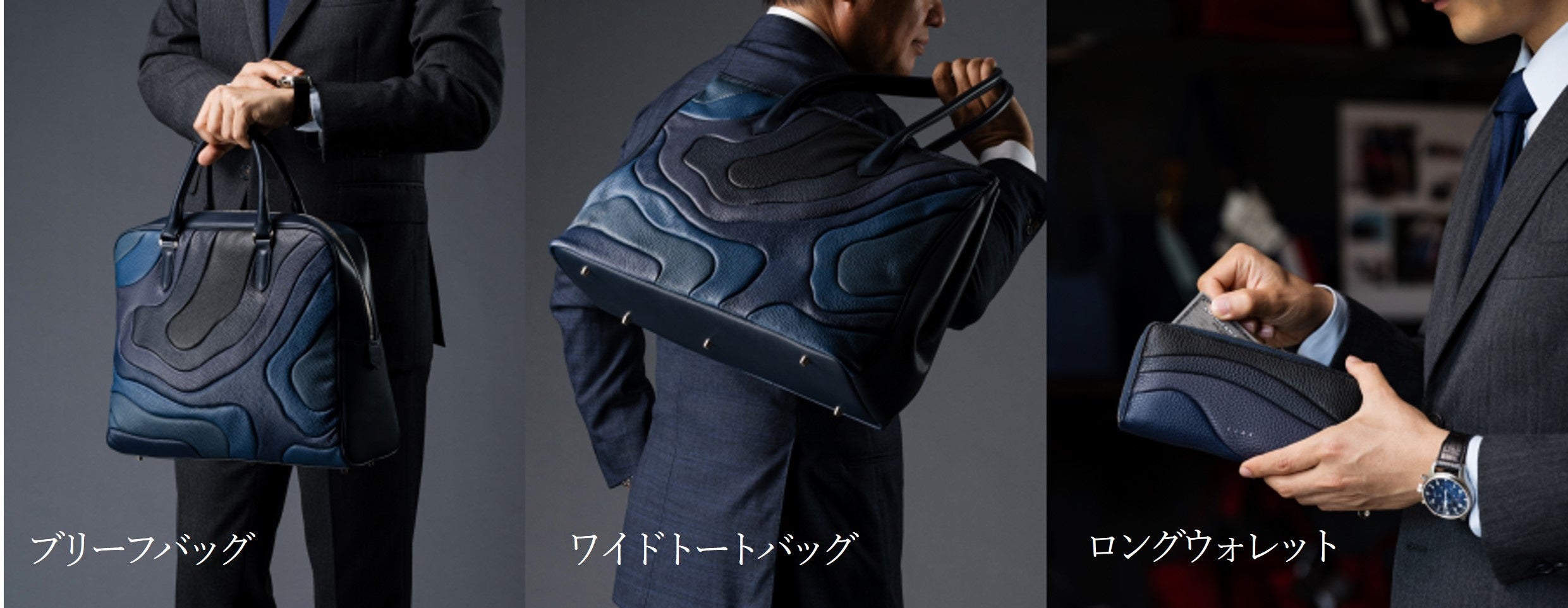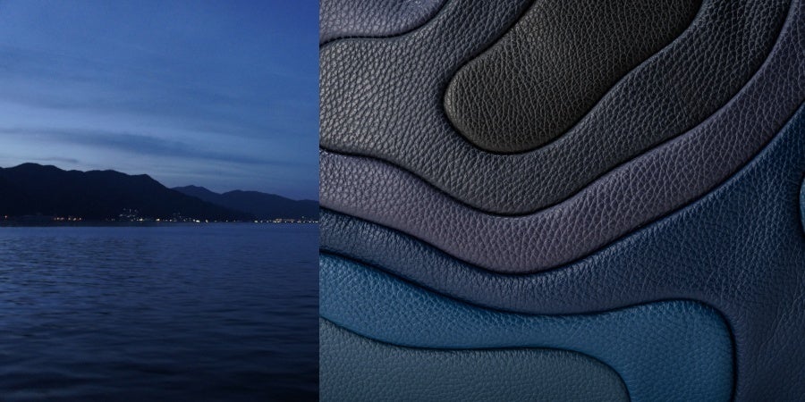 夜の暗闇に包まれた山々、月明かりに照らされた瀬戸内海を美しい発色と上品なツヤが目を惹く6色のレザーで表現した。ビジネスの定番色であるネイビーを基準にしたシックな配色。