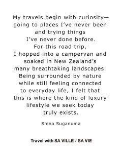 「大自然に身を置きながらも、日常の延長線上にある暮らしが共存する——そんな“ポストラグジュアリー”が息づく場所」と語ってくれた2週間のニュージーランド旅。SA VILLE / SA VIEの服とともにみてほしい。